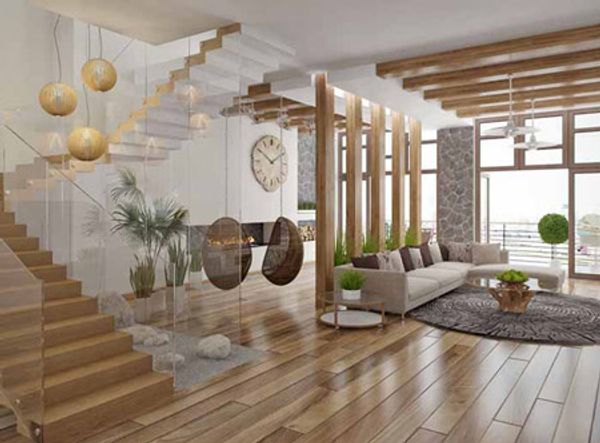 فضا را بانشاط کنید: بگذارید کفپوشهایی از جنس درختهای جنگلی در فضا بدرخشند: آنها را کاملا لخت و عریان رها نکنید، اما همچنین با استفاده از یک فرش بسیار بزرگ آنها را پنهان نکنید. استفاده از لایههای چوبی در قسمتهای دیگر مبلمان که رنگی مشابه یکدیگر دارند فضا را یکدست و جذاب ساختهاند.